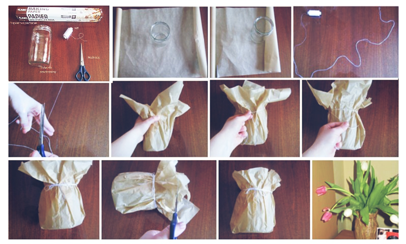 - Tento nápad vznikol keď na MDŽ som dostala kvety, ale vázy niet. Tak som improvizovala s fľašou na zaváraniny, ktorá sa mi nepáčila taká nijaká ku krásnym tulipánom. Skúsila som ju vyzdobiť a vzniklo toto.